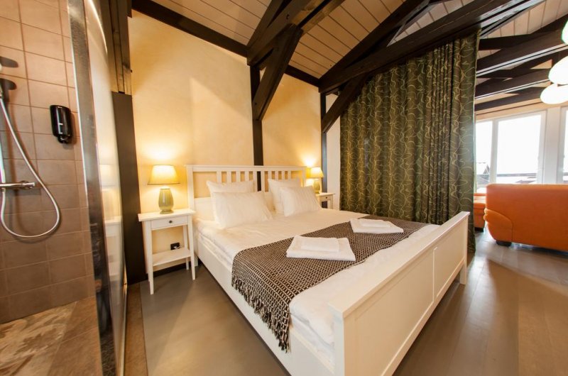 Номера выполнены в современном стиле и различаются по категориям комфортности. У каждого из них есть выход на террасу, с которой открывается прекрасный вид на озеро и на территорию.